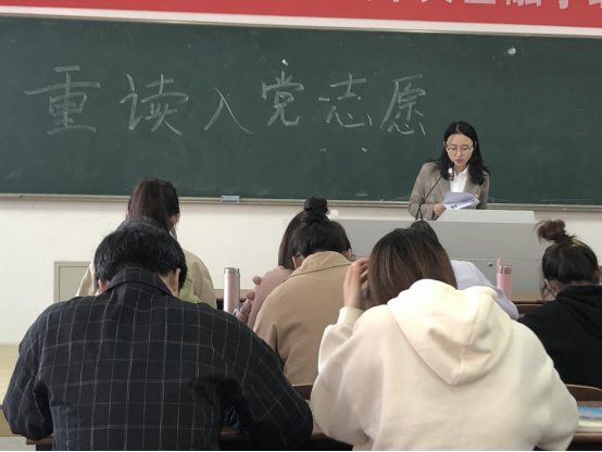 “我要把最好的青春年华献给党!”吴海珍同学重读了她的入党志愿,在入党志愿中回忆入党的初心。吴海珍在学习中勤勤恳恳,积极参与各类学科竞赛与社会活动,作为一名党员她身体力行,用行动讲述了一位员工党员服务社会奉献人民的初心。班长刘逸菲同学重读了她的入党志愿书,分享了入党动机,讲述了个人成长经历。她将理论化为实践,躬行实践一名共产党人的奉献服务精神,在节假日服务家乡,与家乡共成长!退伍士兵郑佳重读了他的入党志愿,并表示,当兵时愿意随时为党和人民牺牲自己的生命,现在亦然!