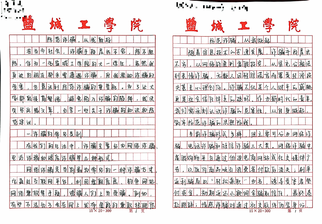 在征文活动中,同学们以“防范诈骗,从我做起”为主题,总结被诈骗的常见类别,分析被诈骗的原因,为加强防范意识提出具体可行的建议。