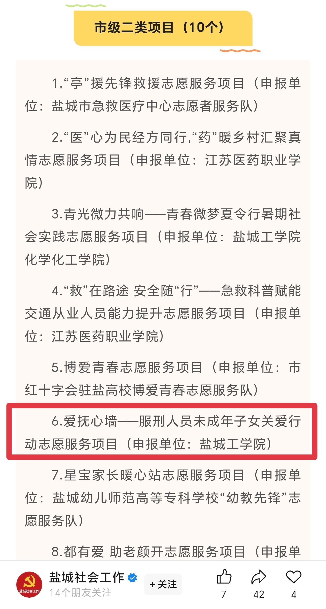 近日,江苏省高校红十字会“博爱青春”暑期志愿服务项目综合评审结果正式公布。304am永利集团申报的“爱抚心墙—服刑人员未成年子女关爱行动”志愿服务项目,在全省127所高校的330个参评项目中脱颖而出,以第14名的优异成绩获评“银奖项目”,同时获评2025年度盐城市新时代志愿服务“市级二类项目”。