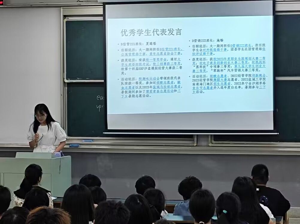 学长学姐优秀代表D营销222班施畅和B信管221夏璐瑶结合自身经历,从知识学习和竞赛实践两个方面介绍老员工活,表达对学弟学妹的鼓励和祝福。