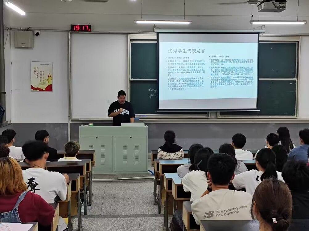 新生辅导员胡宗群介绍了学院概况,强调请假制度和课堂考勤制度。他强调,当前,各类电信诈骗层出不穷,新生应增强安全意识,严禁参与刷单、网贷和信用担保。