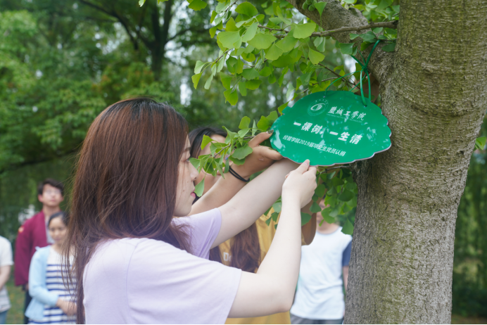 仪式上,毕业生党员和考取研究生的毕业生代表们分别选择树,为树苗挂上寄语牌,并和认捐的树木合影留念,一起留下年轮的印记,留下对母校的牵挂与感恩,留下对未来的希冀与向往。考取上海理工大学硕士研究生的毕业生党员代表王静怡说:“时光的流逝就像树木的年轮一样一圈一圈地增加,很幸运能够参加如此有仪式感的活动,我们认捐的树木将成为一种独特的纪念,留下我们的印迹,延续我们的温情与祝福。”