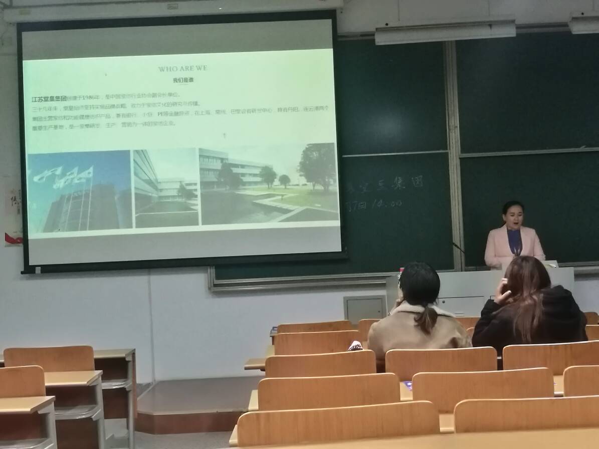 宣讲会一开始,堂皇集团的负责人通过播放宣传片、PPT展示等方式向同学们简要地介绍公司的概况。堂皇集团创建于1986年,总部设立在江苏省丹阳市塘皇镇,在常州、上海均设有分公司。作为中国家纺行业协会副会长单位,堂皇一直致力于为人们提供健康,舒适,有品位的居家生活,为亿万家庭带来高品质优雅舒适的生活体验,以国际视野与标准推进中国家居产业的发展。紧接着,该负责人介绍了堂皇集团本次招聘会主招包括电商客服、平面设计师、新媒体运营在内的13个就业岗位,并提出了能吃苦、有责任心、有扎实的基础知识、较好的工作能力等希望。对于企业员工的待遇,该负责人也介绍了堂皇集团平台大、待遇优、环境好的福利体系。在堂皇集团可以进行文体活动修养身心,更有包括五险一金缴纳、带薪休假、节日礼包、午餐补贴、免费住宿、周末双休等。据负责人表示,若想加入堂皇集团这个大家庭,可以网上申请报名相关事宜,亦可以投递简历,通过现场初试、笔试、专业技能测试后就会安排笔试,希望同学们积极投简报名。