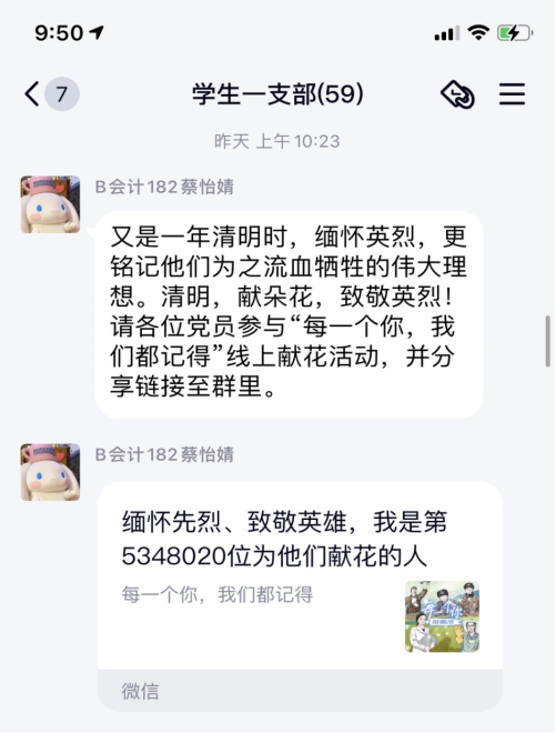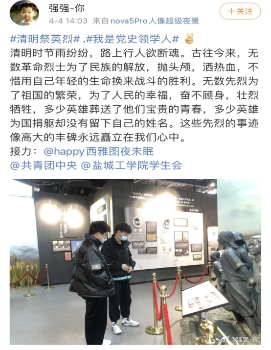 4月4日-5日,学院青年团员响应团中央号召,在微博晒出在各地人民英雄纪念碑、英烈纪念馆等参观的照片,一起缅怀逝者、纪念英烈,并参与“缅怀先烈、致敬英雄”献花活动。同时在“与总书记一起缅怀英烈”群内打卡时,积极发言,纷纷表示要以革命先烈为榜样,从中汲取精神营养,在今后的学习工作中,不忘初心,努力奋进,弘爱国精神,立报国之志,谱写未来新篇章!B会计182班蔡怡婧感慨道:“清明看山河,心香作然诺。先烈筑国土,吾辈当自强。”