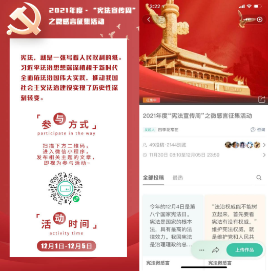 为引导员工深入学习宪法,成为“宪法卫士”,11月30日至12月5日,公司开展2021年度“宪法宣传周”系列活动。活动包括主题班会、宪法观影以及微感言征集等,活动采用线上、线下相结合的方式,动员全体同学参加,营造了全院学法、守法、懂法、用法的良好氛围。