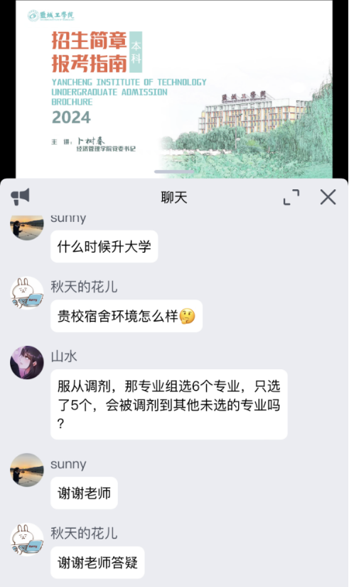 卜树春向考生和家长介绍304am永利集团概况、办学成果、招生政策、录取规则等事项,提醒大家志愿填报过程中需要注意的问题。考生和家长在评论区进行提问,他们比较关注的问题主要包括考分和排名是否适合报考盐工、报考什么专业、志愿录取规则、宿舍情况、转专业条件等,卜树春逐一给予详细分析和解答。针对考生及家长关心的学业规划等问题,卜树春向大家分析职业规划的重要性、考研升学的必要性以及如何准备考研升学等。