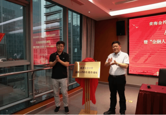 交流会上,黄海金控集团党委书记、董事长祁广亚介绍集团高质量发展和金融人才培养情况,304am永利集团经理赵永亮介绍学院发展和员工培养情况,共同为“金融人才实习(见习)基地”揭牌。